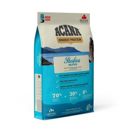 Every ACANA® recipe is thoughtfully crafted from start to finish with premium ingredients. With the highest protein offering in ACANA pet foods, our ACANA Highest Protein Pacifica® Recipe is rich with 70%1 quality animal ingredients like whole mackerel, herring, rockfish, hake, and flounder, balanced with 30%2 fruits, vegetables, and botanicals, many delivered daily. Artificial colours, flavours or preservatives are never added in our kitchen.