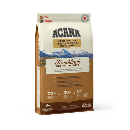 Every ACANA® recipe is thoughtfully crafted from start to finish with premium ingredients. With the highest protein offering in ACANA pet foods, our ACANA Highest Protein Ranchlands® Recipe is rich with 70%1 quality animal ingredients like ranch-raised4 beef, pork, lamb, freshwater lake fish and bison, balanced with 30%2 fruits, vegetables, and botanicals, many delivered daily. Artificial colours, flavours or preservatives are never added in our kitchen.