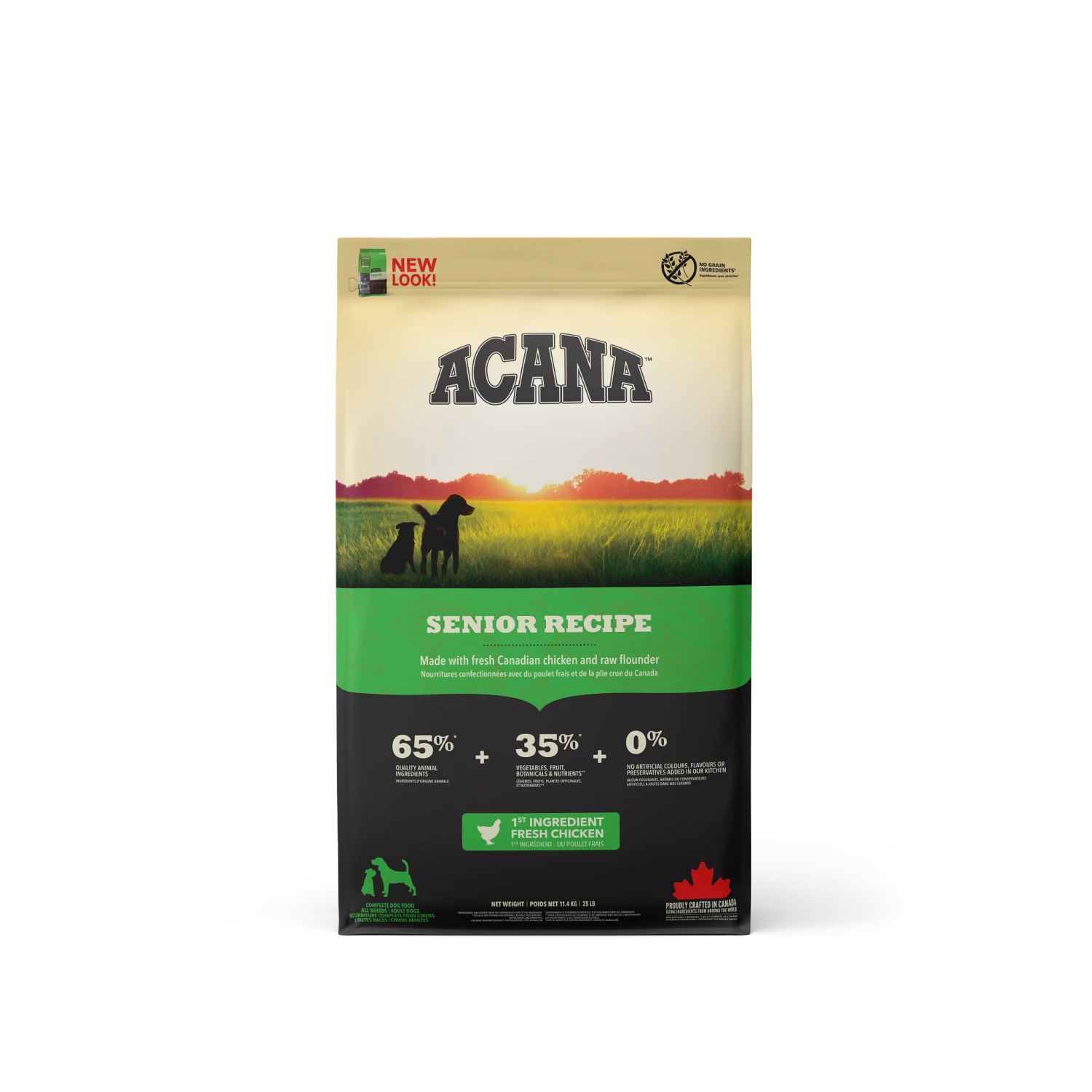 When it comes to ACANA® food for dogs, every ingredient matters. That’s why our Senior Recipe is thoughtfully crafted to help nurture your mature or senior dog. Rich with 65%1quality animal ingredients like fresh Canadian chicken and raw flounder balanced with 35% fruit, vegetables & botanicals, this recipe provides a balanced diet that will help maintain the health of your senior dog. With quality animal ingredients balanced with fruit, vegetables and botanicals delivered daily, every meal of ACANA Senior Recipe is like it came from the farmer’s market.