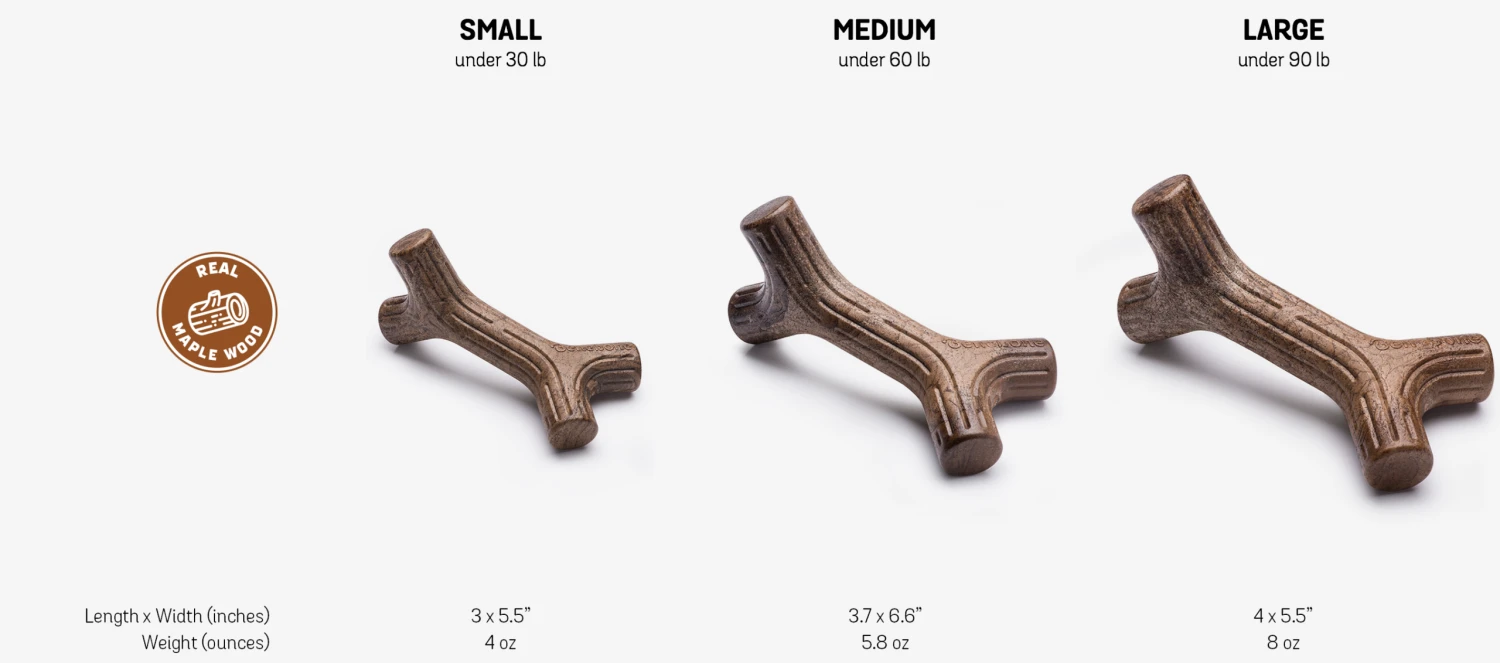 Benebone Maplesticks come in SMALL, MEDIUM, and LARGE and just one flavor – maple wood. Weight is only a rough guide to sizing, and cannot replace the monitoring of a dog’s chewing habits. When in doubt, choose the larger size chew toy for safety’s sake.