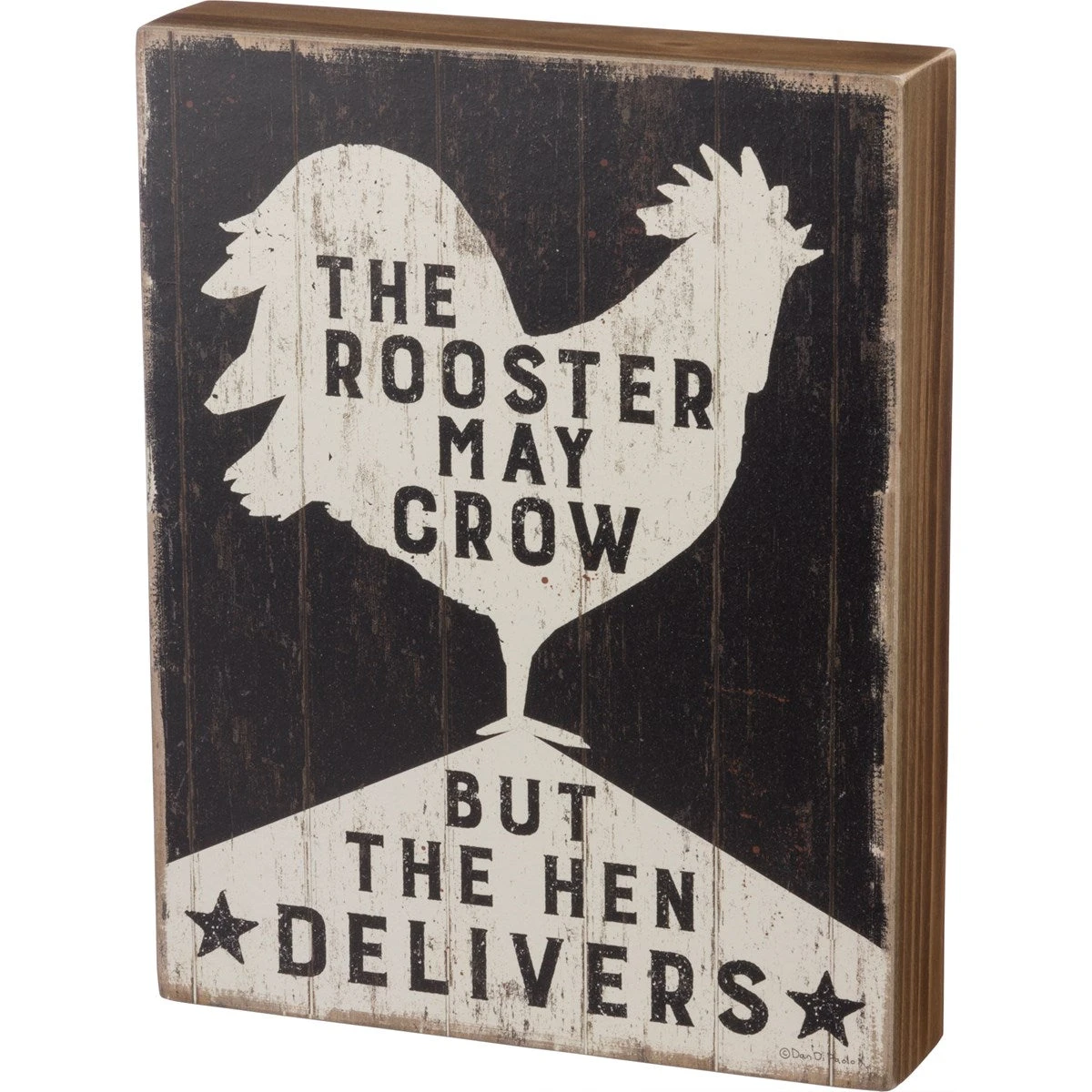 A rustic wooden box sign lending a distressed “The Rooster May Grow – But The Hen Delivers” sentiment with rooster silhouette design in a neutral palette. Complements well with coordinating design pieces or existing decor. Easy to hang or can free-stand alone.