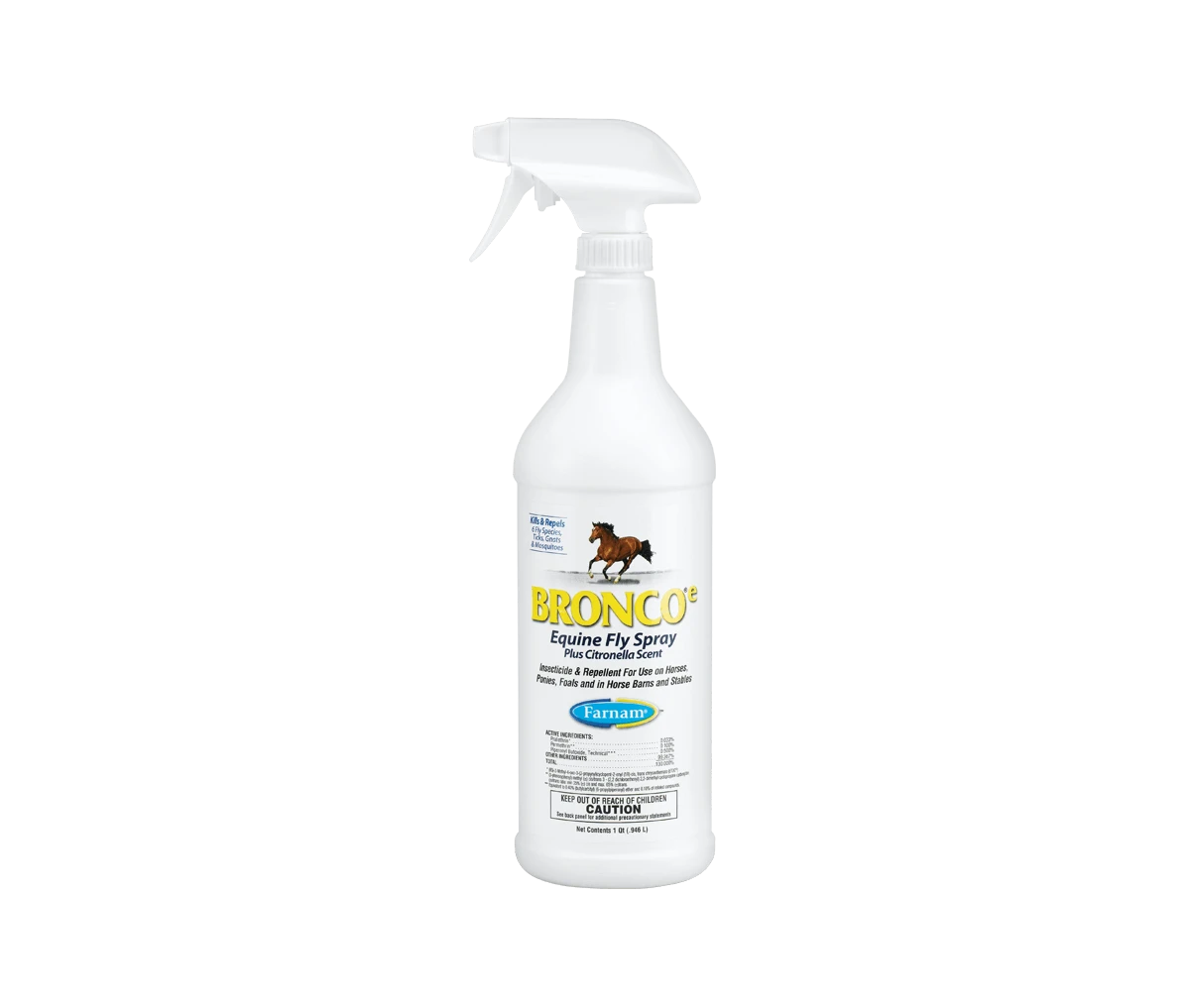 Bronco®e Equine Fly Spray is a staple for every stable. Kills six fly species, gnats, ticks, deer ticks, fleas, chiggers and lice! Insecticide and repellent for use on horses, ponies, foals and in horse barns and stables.