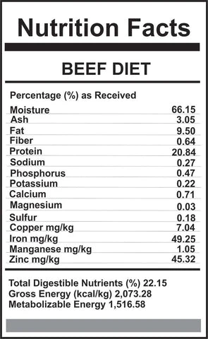 The Carnivora Whole Animal Beef diet is lower in protein than some of the other whole animal diets. Our pasture-raised beef is lower in polyunsaturated omega-6 fatty acids and saturated fats than feedlot beef making it healthier. As it is lean, it is good food for less active pets, but still very valuable food for any carnivore. It is a rich source of iron and therefore a good food for building blood. Beef is a popular rotational food for those animals that do not have an intolerance to it.
