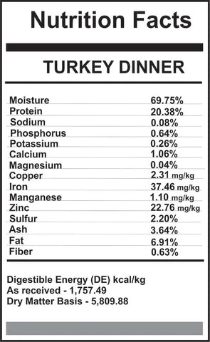 Carnivora Whole Animal Turkey Diet and Turkey Dinner are high in protein and lower in fat than most red proteins. It provides a rich source of iron, zinc, phosphorus, potassium and B vitamins. In terms of minerals, turkey is richest in selenium. Zinc, copper, phosphorus, magnesium, potassium, and iron are also provided by this food in noteworthy amounts. Turkey is a good protein source as part of a varied diet. Turkey contains more protein per ounce than other meats. The white meat of turkey is generally considered healthier than dark meat because of its lower saturated fat content, but the nutritional differences are small.