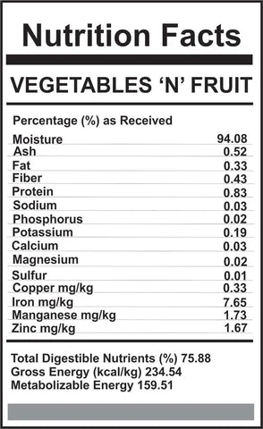 Specific ratios of Vegetables ‘n’ Fruit can provide therapeutic advantages for pets that have diabetes, pancreatic, liver or advanced kidney disorders. Some dogs may require extra fiber in their diet to keep them satisfied while on a weight loss program. Fiber in Vegetables ‘n’ Fruits and Beef Green Tripe influences the rate of passage of food through the intestine by increasing or slowing stomach emptying, but specific effects vary with the amount fed. Excessive dietary fiber is associated with adverse effects such as the production of loose stools; flatulence, increased stool volume and frequency, and decreased dietary caloric density.
