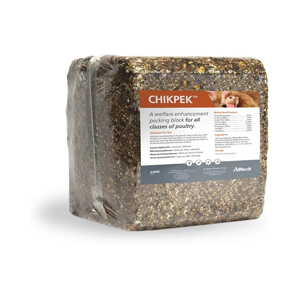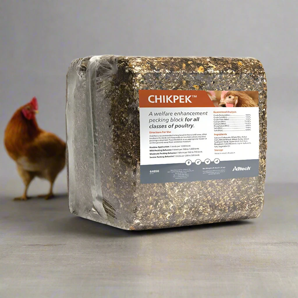 Place the ChikPek™ block in areas where birds frequently gather or where feather pecking is observed. Use a secure feeder or place directly on dry ground, away from moisture. Multiple blocks may be needed for larger flocks or different coop zones.