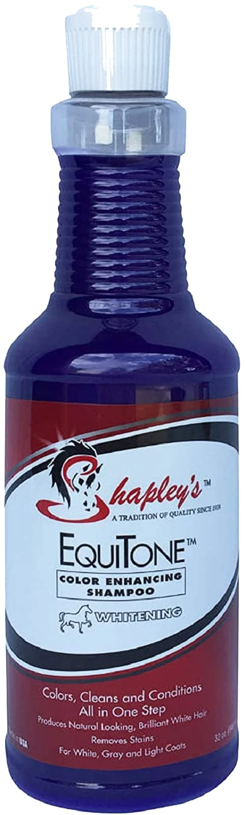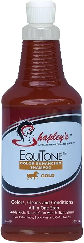 Shapley’s™ EquiTone “Colour Enhancing Shampoo” For Horses & other Farm Animals…great for Dogs too! Shapley’s formula is a single step process that adds rich, brilliant color as it cleans and conditions! Adds vibrancy and vitality Natural looking, rich color with brilliant shine Smoother, silkier, shinier hair Rejuvenates sun damaged hair Rich foamy lather Rinses easily Saves time and money Complements Shapley’s “Show Touch-up” color enhancing sprays #0708 – White #0705 – Black #0706 – Gold #0707 – Red Choose your Color: BLACK for blacks and Bays WHITENING for Grays & White manes & tails GOLD for Palominos and Buckskins RED for Chestnuts, Sorrels & Browns Available in 473mL