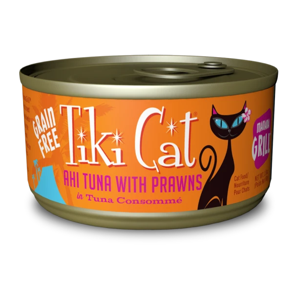 Tiki Cat Grill recipes give cats their seafood fix with indulgent flaked fish recipes garnished with shellfish. They contain real, recognizable ingredients that are high protein and grain free because cats are carnivores. Tiki Cat Manana Grill features wild-caught ahi tuna topped with real, whole prawns in a succulent tuna consommé. Tiki Cat Grill is complete and balanced for all life stages and provides high moisture to give cats the supplemental water they need.