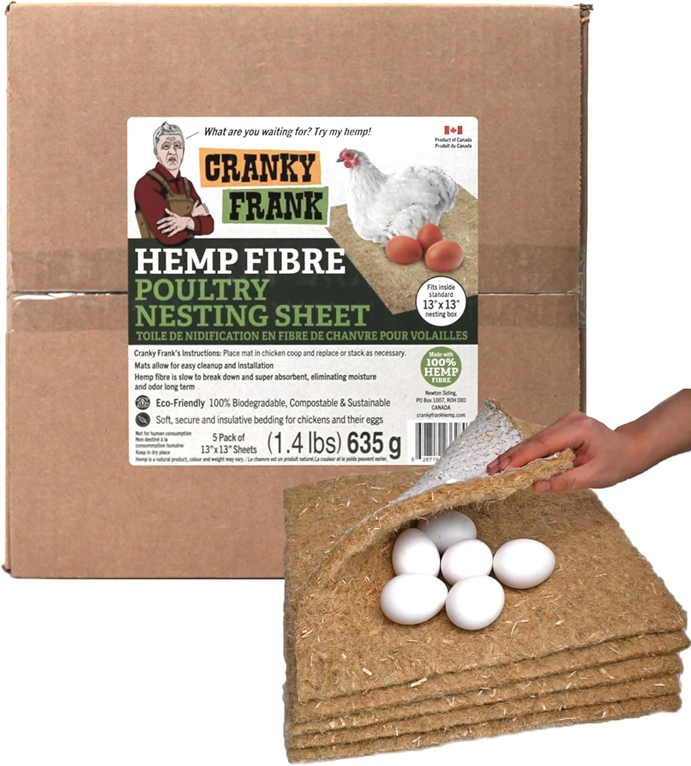 These chicken nesting pads come in a pack of five, offering superior absorbency and hypoallergenic benefits. Hemp’s natural ability to absorb moisture and odors makes cleaning chicken nesting boxes effortless. These pads are easy to install and replace, reducing labor and simplifying maintenance. Designed to be soft, durable, and insulating, they provide a comfortable and secure environment for hens and their eggs. Long-lasting moisture and odor control keeps your flock healthy and odor-free. Fully biodegradable and compostable, these pads support sustainable farming by returning nutrients to your garden while helping reduce carbon footprint.