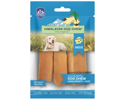 Himalayan Dog Chew® is the original® long-lasting, hard smoked cheese chew — registering an 8 on our Chewmeter. It was created from an ancient recipe and made using traditional methods with yak and/or cow milk. Dogs must work the end of the treat for hours, softening it with their mouths before small parts of it can be slowly chewed off. When you give this treat to your dog, you know that you are providing them with high-quality eating entertainment. When the chew becomes a small piece, take the leftover end away. Soak it in warm water for 5 minutes, heat in the microwave on high power for approx. 45 seconds to create a cheesy puffed treat. Let it cool for 2 minutes and treat your dog to a homemade puff!