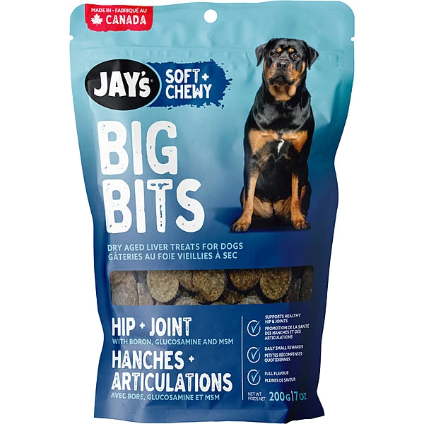 Jay’s Big Bits Hip & Joint Dog Treats are kettle cooked, simmered, and dry aged for superior flavour and quality. These treats are soft and chewy and include over 60 % fresh animal protein. They are also loaded with Glucosamine, MSM, and Boron to give your dog a daily dose of hip and joint support with all the flavour.