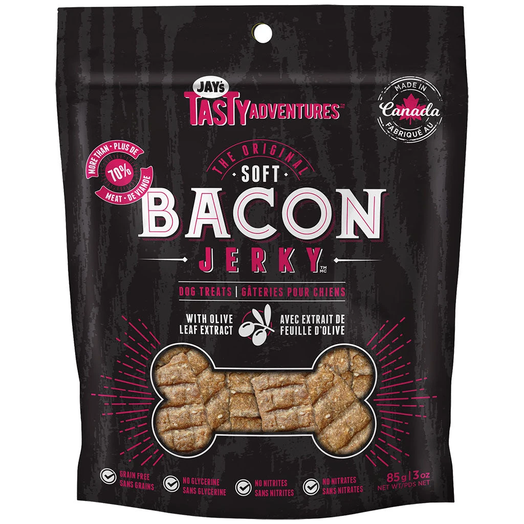 Jay’s Tasty Adventure Dog Treats – Original Soft Bacon Jerky are delectable bites of gently cooked, air dried jerky with the delicious taste of honey-sweetened pork bacon. Made only using natural, limited ingredients and packed with over 70% meat, these uncured dog treats are free of nitrites and nitrates and full of mouthwatering flavour.