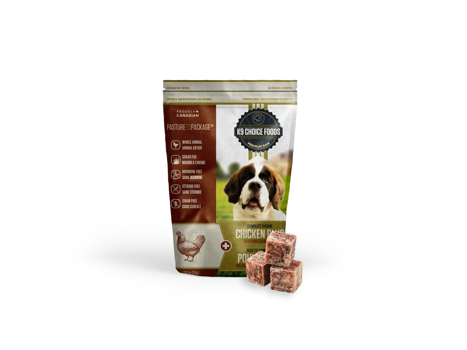 Premium, free-range whole chickens TRIPLE GROUND. Bone-in to a fine texture, carefully mixed with offal and the freshest of seasonal fruits & vegetables.