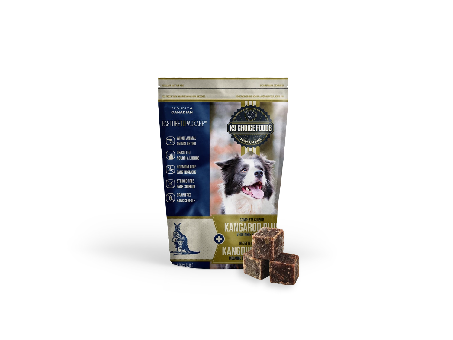 Open range Kangaroo Meat complete with minced bone, precisely mixed with offal and the freshest of seasonal fruits & vegetables.