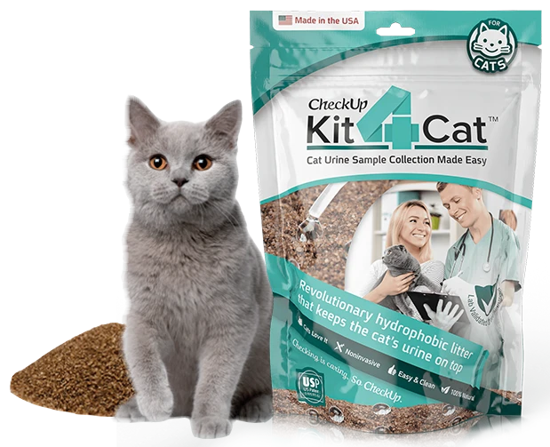 Kit4Cat is the name of our patented hydrophobic litter that keeps cat urine on top, making sample collection stress-free! The “litter” smells and feels like regular sand with a natural non-toxic repellent coating. It allows veterinarians, technicians and cat parents to easily passively collect a urine sample without resorting to painful invasive procedures like Cystocentesis. The kit comes with everything you need to collect a urine sample.