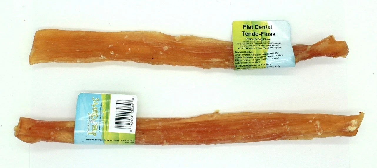 These dental tendons come in singles (Brazilian Beef). These vary in length 9″+. They are individually labelled with UPC and French / English. This is a beef cervico-occipital tendon.