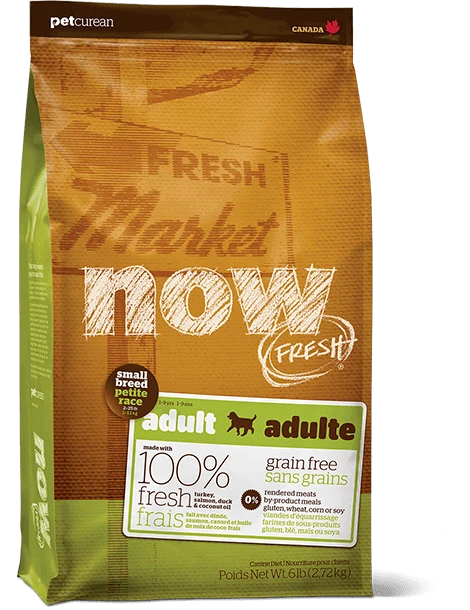 NOW FRESH™ Small Breed Adult Recipe is made with 100% FRESH turkey, salmon, duck, and 100% fresh Omega 3 & 6 oils from coconuts and canola. NOW FRESH™ also features zero grains, gluten, wheat, beef, corn or soy. Zero rendered meats, by-products or artificial preservatives.