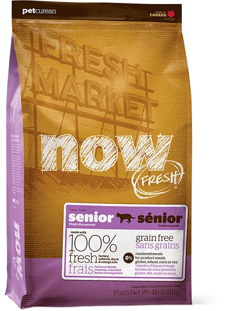 NOW FRESH™ Senior cat food recipe is made with 100% FRESH turkey, salmon, duck and 100% fresh Omega 3 & 6 oils from coconuts and canola. NOW FRESH™ also features zero grains, gluten, wheat, beef, corn or soy. Zero rendered meats, by-products or artificial preservatives.