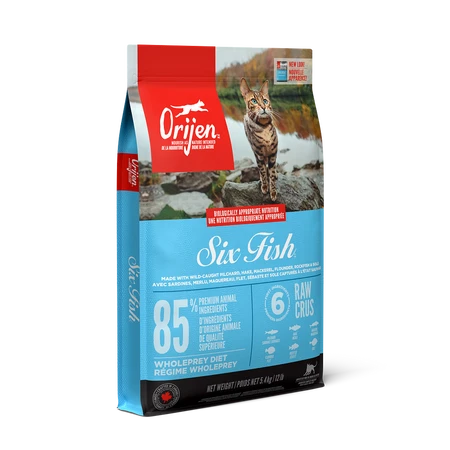 Help your cat thrive with the power of protein-rich recipes that provide peak nourishment. As obligate carnivores, modern cats are built like their ancestors and thrive on a Biologically Appropriate diet rich in protein and fat sourced from a variety of animal ingredients. ORIJEN® Six Fish diet is made with fish from raw1 wild-caught pilchard, hake, mackerel, flounder, rockfish and sole. Packed with WholePrey animal ingredients like fish, organs and bone, ORIJEN Six Fish diet is made with the most nutrient-dense, succulent parts of the prey to deliver the nutrition cats need. With 85%2 quality animal ingredients and a freeze-dried liver coating, this diet is beyond comparison.