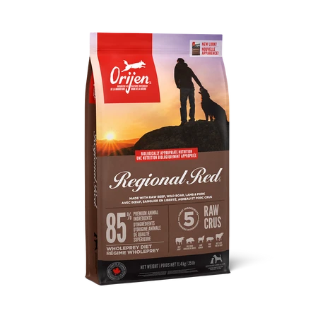 Help your dog thrive with the power of protein-rich recipes that provide peak nourishment. Dogs are ancestral carnivores, so they need a Biologically Appropriate diet rich and varied in whole animal ingredients. ORIJEN® Regional Red diet is packed with 85%1 quality animal ingredients like raw2 beef, wild boar, lamb, pork and salmon. Packed with WholePrey animal ingredients like organs and bone, ORIJEN food is made with the most nutrient-dense, succulent parts of the prey to deliver the nutrition dogs need. The result is a diet for your canine companion that is beyond comparison.