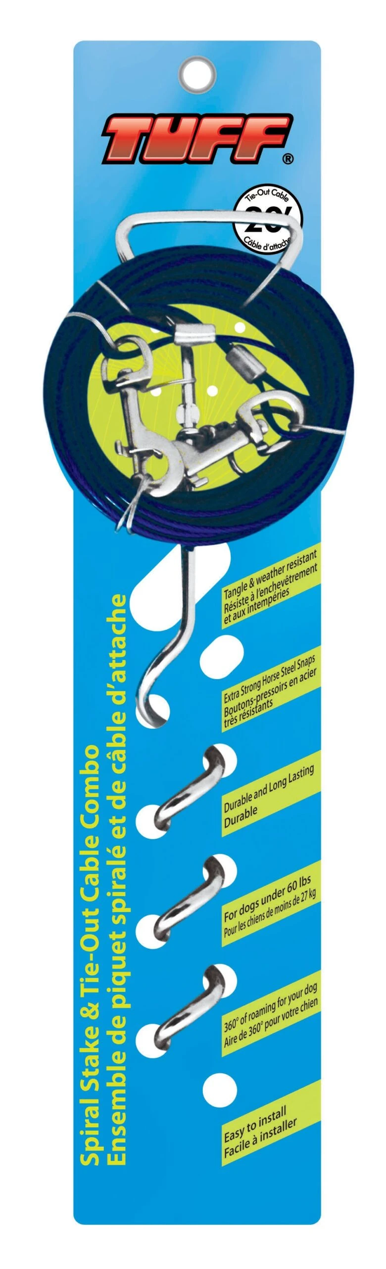 20 foot tie-out cable. Tangle & weather resistant, extra strong horse steel snaps durable and long lasting for dogs under 60 lbs. 360 degrees of roaming for your dog easy to install