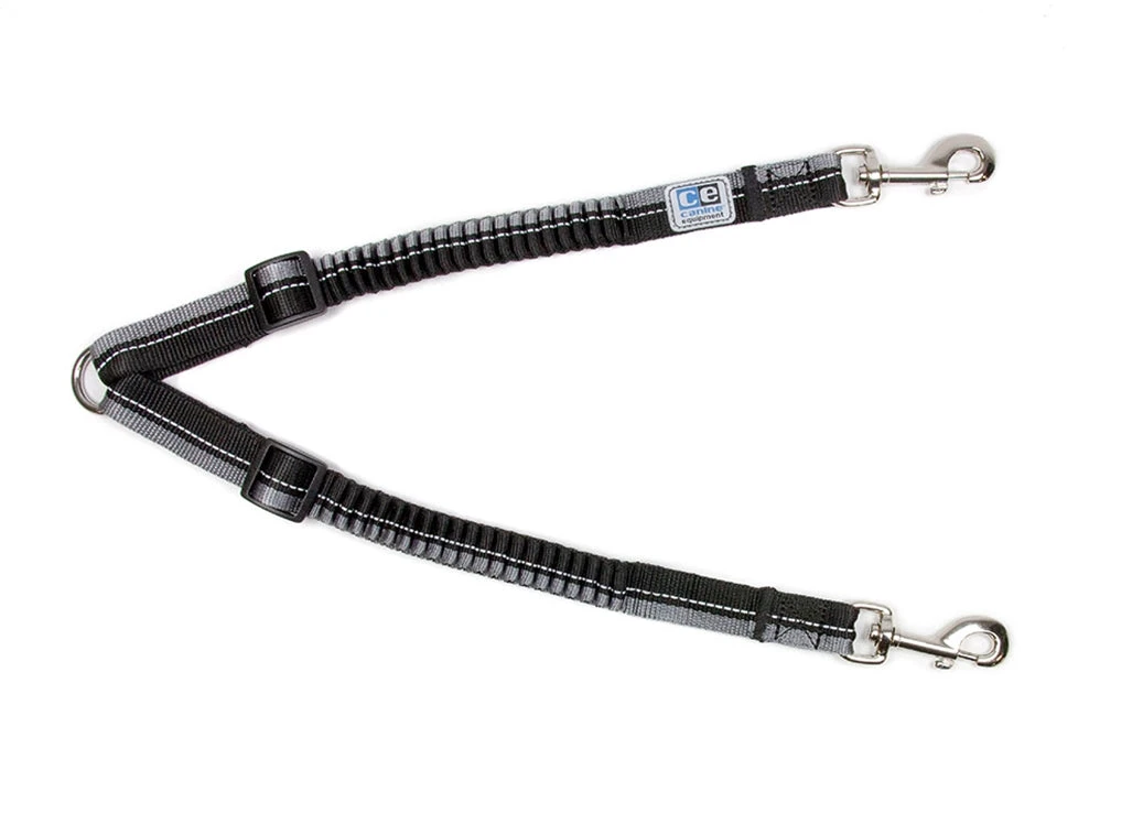 The Bungee Coupler acts as a handy shock-absorbing lead that eases the impact of a pulling dog and aids in avoiding the pains of tangled leashes when walking more than one dog. Our Bungee Coupler pairs perfectly with our Ultimate Pulling Harness if you skijor, bikejor or canicross.