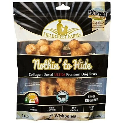 Nothin’ to Hide chews are a highly digestible alternative to rawhide. Wholesome beef flavored chews are sure to offer a safe, flavorful chewing experience for your pets. What makes these ultra? It’s their high density and strength that allows for extended chew time. Chewing helps satisfy your pets natural desire to chew. Chewing also promotes strong teeth and healthy gums. 7″ Wishbones 2 pack.