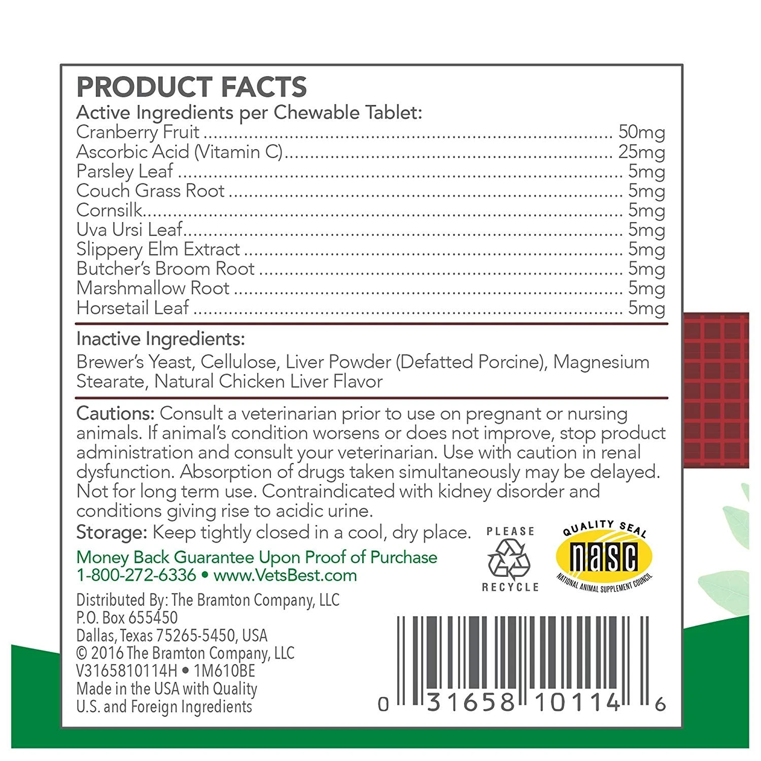 Vet’s Best Feline Urinary Tract Support helps to support a normal, healthy tract function in cats. Feline Urinary Tract Support uses key natural ingredients (cranberry, parsley, and horsetail) to maintain healthy acidic and free-flowing level. For best results, break tablets into smaller pieces to release ingredients and flavor, and give cat one or two tablets daily.