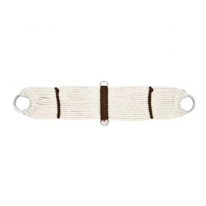 This rayon cinch is a traditional favorite great for all riding needs. Features woven-in dees for tie down strap and back cinch attachment. Durable nickel plated hardware. White with brown accents. Horse size.