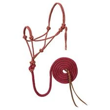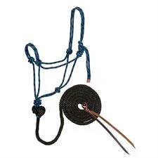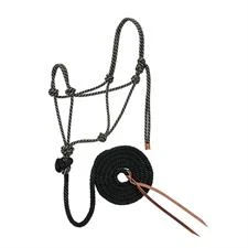 A great halter at a great price! This halter is made from a continuous piece of 3/8″ poly rope with a hand-knotted construction and a double noseband and crown strap. The hollow braid spun poly lead measures 1/2″ x 10′